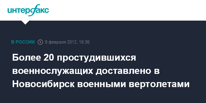 Москва. 8 февраля. INTERFAX.RU - В Военно-клинический госпиталь Новосибирска двумя вертолетами направлен 21 заболевший военнослужащий из 62-ой ракетной дивизии (воинская часть 32441).