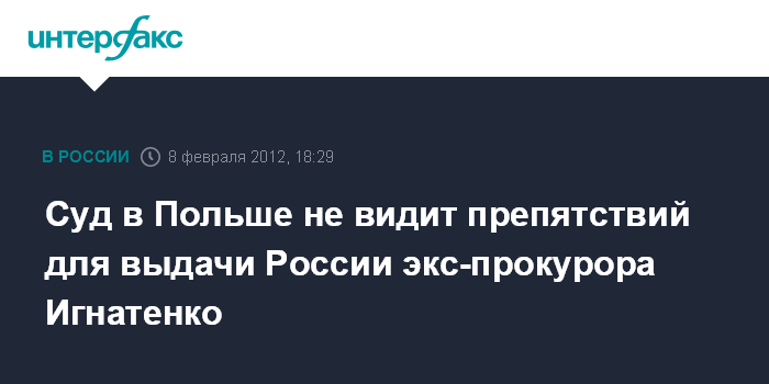 Москва. 8 февраля. INTERFAX.RU - Суд в Польше принял решение выдать России бывшего зампрокурора Московской области Александра Игнатенко, сообщает Первый канал.
