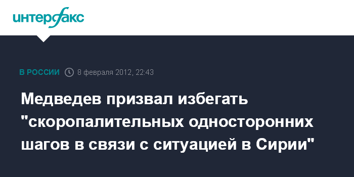 Медведев призвал избегать "скоропалительных односторонних шагов в связи с ситуацией в Сирии"