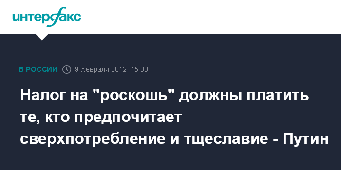 "Он должен стать своего рода общественно признанной платой за отказ от инвестиций в развитие - в пользу сверхпотребления и тщеславия. Фискальное значение налога не стоит преувеличивать ", - сказал Путин на съезде РСПП.