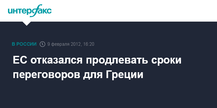 Брюссель. 9 февраля. INTERFAX.RU - Евросоюз не планирует продлевать сроки переговоров лидеров политических партий Греции по согласованию сокращения бюджетных затрат еще на 300 млн евро, сообщил официальный представитель Еврокомиссии Амадеу Альтафаж Тардиу.