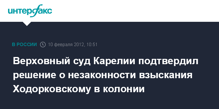 Петрозаводск. 10 февраля. INTERFAX.RU - Верховный суд Карелии оставил в силе решение Сегежского суда о незаконности взыскания бывшему руководителю НК "ЮКОС" Михаилу Ходорковскому, сделанного ему в колонии за отсутствие на рабочем месте.