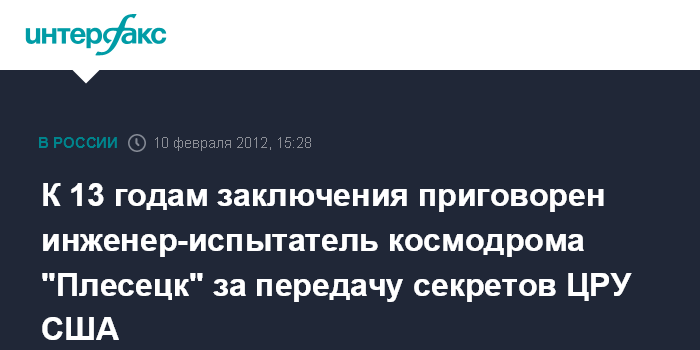 К 13 годам заключения приговорен инженер-испытатель космодрома "Плесецк" за передачу секретов ЦРУ США