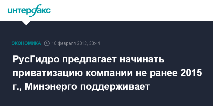 Москва. 10 февраля. ИНТЕРФАКС - ОАО "РусГидро" (РТС: HYDR) предлагает начинать процесс приватизации госпакета акций компании не ранее 2015 года.