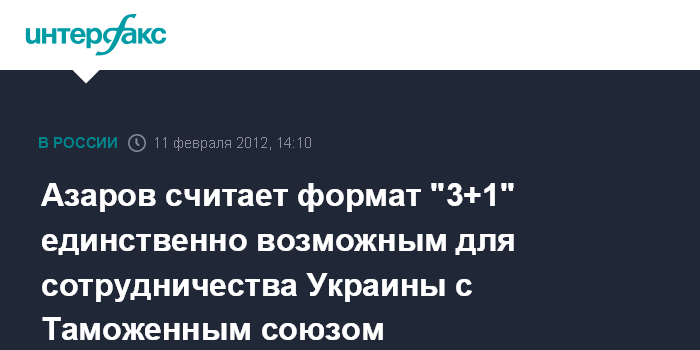 Киев. 11 февраля. INTERFAX.RU - Премьер-министр Украины Николай Азаров надеется, что Таможенный союз будет сотрудничать с Украиной в формате "3+1". "Мы предложили нормальный формат сотрудничества "3+1". Нам говорят: "Нет, такой формат нам не подходит". Я надеюсь, что рано или поздно такой формат будет принят, потому что по-другому просто не может быть", - сказал он на встрече с членами клуба главных редакторов стран СНГ, Балтии и Грузии в субботу в Киеве.