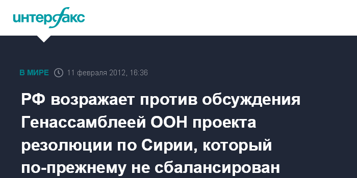 РФ возражает против обсуждения Генассамблеей ООН проекта резолюции по Сирии, который по-прежнему не сбалансирован