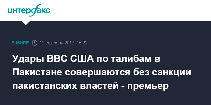 Исламабад. 12 февраля. INTERFAX.RU - Удары беспилотных самолетов ВВС США по лагерям боевиков движения "Талибан" на пакистанской территории наносятся без получения разрешений на то со стороны пакистанских властей, заявил в воскресенье премьер-министр Пакистана Юсуф Раза Гилани в интервью телеканалу "Аль-Джазира".