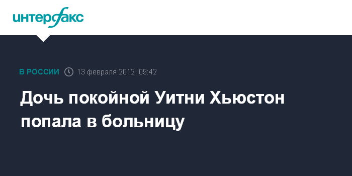 Лондон. 13 февраля. INTERFAX.RU - Восемнадцатилетняя дочь скончавшейся в воскресенье американской певицы и актрисы Уитни Хьюстон госпитализирована спустя несколько часов после смерти матери, сообщает BBC в понедельник.