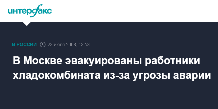 Москва. 23 июля. INTERFAX.RU - В Москве из-за угрозы технологической аварии эвакуированы работники 15-го хладокомбината, пострадавших нет, сообщил "Интерфаксу" источник в правоохранительных органах в среду.