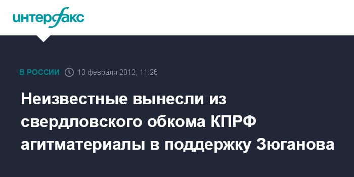 Екатеринбург. 13 февраля. INTERFAX.RU - Семьдесят тысяч газет и двадцать коробок наклеек с агитацией за кандидата в президенты РФ Геннадия Зюганова похитили в минувшие выходные из офиса свердловского обкома КПРФ, утверждают коммунисты.