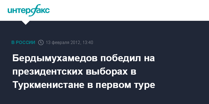Ашхабад. 13 февраля. INTERFAX.RU - Согласно данным ЦИК Туркменистана, на выборах президента страны, состоявшихся 12 февраля, победил действующий глава республики Гурбангулы Бердымухамедов.