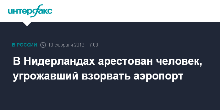 Амстердам. 13 февраля. INTERFAX.RU - Человек, угрожавший устроить взрыв в амстердамском аэропорту "Схипхол", арестован в понедельник в Нидерландах, сообщили представители голландской военной полиции.