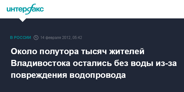 Владивосток. 14 февраля. ИНТЕРФАКС-ДАЛЬНИЙ ВОСТОК - Строительная бригада при земляных работах повредила водопровод в Первомайском районе Владивостока, из-за чего часть жителей осталась без воды.