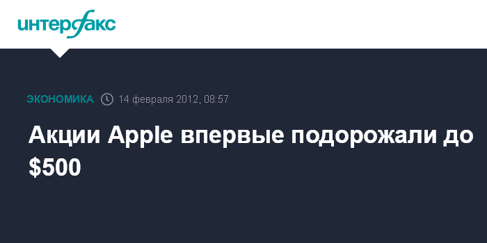 Москва. 14 февраля. INTERFAX.RU - Акции Apple Inc. в понедельник впервые превысили отметку в $500 за штуку после двухнедельного периода роста, вызванного блестящими показателями работы компании по итогам перового финансового квартала, сообщает агентство Bloomberg.