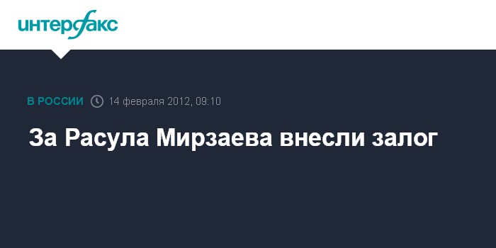 Москва. 14 февраля. INTERFAX.RU - Родственники чемпиона мира по самбо Расула Мирзаева, обвиняемого в причинении смерти по неосторожности 19-летнему студенту Ивану Агафонову, внесли залог в размере 100 тыс. рублей за его освобождение.