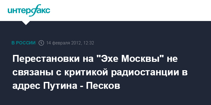 Москва. 14 февраля. INTERFAX.RU - Пресс-секретарь премьера РФ Дмитрий Песков категорически отрицает любую связь изменений в совете директоров "Эхо Москвы" с критикой радиостанции в адрес Владимира Путина.