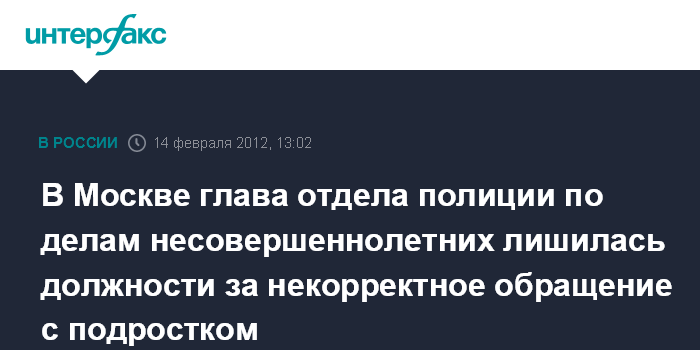 Москва. 14 февраля. INTERFAX.RU - Начальник отдела полиции по делам несовершеннолетних столичного района Люблино будет уволена из-за некорректного обращения с подростком, сообщили во вторник "Интерфаксу" в ГУ МВД России по Москве.