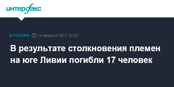Каир. 14 февраля. INTERFAX.RU - Вооруженные столкновения между ливийскими племенами, проживающими на юго-востоке страны на границе с Чадом, привели к гибели 17 человек, еще 20 человек получили ранения, сообщает во вторник египетская газета "Аль-Ахрам".