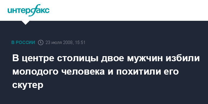 Москва. 23 июля. INTERFAX.RU - В центре Москвы двое мужчин избили молодого человека и похитили его скутер, сообщили "Интерфаксу" в управлении информации и общественных связей ГУВД Москвы в среду.