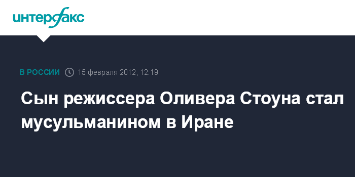 Лондон. 15 февраля. INTERFAX.RU - Сын известного американского кинорежиссера и продюсера Оливера Стоуна Шон принял ислам в Иране, сообщает в среду британская газета The Daily Telegraph. Его новое мусульманское имя - Али.