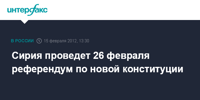Бейрут. 15 февраля. INTERFAX.RU - Сирийский президент Башар Асад назначил проведение референдума по новой конституции на 26 февраля, сообщило в среду государственное телевидение.