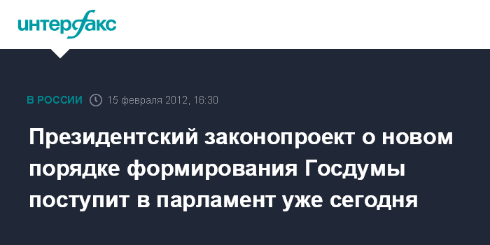 Горки. 15 февраля. INTERFAX.RU- Президент РФ Дмитрий Медведев намерен в среду внести в Государственную думу законопроект о новом порядке формирования нижней палаты парламента.