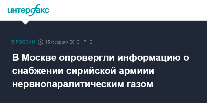 "В Москве обратили внимание на появившиеся в СМИ сообщения, что сирийская армия будто бы применяла в ходе столкновений в городе Хомс нервнопаралитический газ, причем делала это якобы под контролем специалистов из России. Подобного рода измышления категорически отвергаем", - говорится в комментарии департамента информации и печати МИД РФ, распространенном в среду.