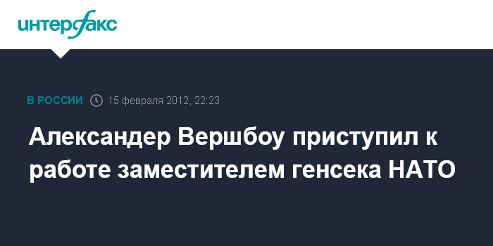 Брюссель, 15 февраля. INTERFAX.RU - Бывший посол США в России Александер Вершбоу приступил в среду к работе в качестве заместителя генерального секретаря НАТО. Это второй по рангу гражданский пост в западном военно-политическом альянсе.