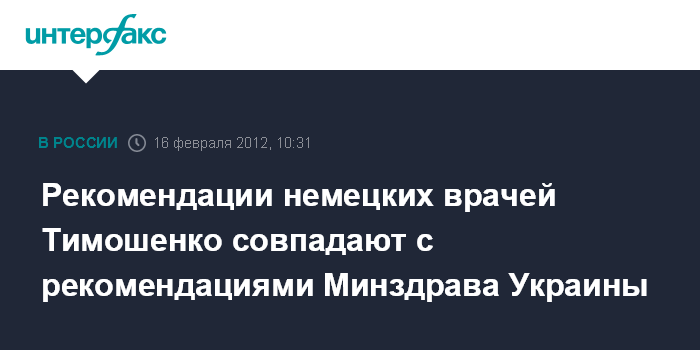 Харьков. 16 февраля. INTERFAX.RU - Предварительные рекомендации, данные немецкими врачами после обследования экс-премьера Украины Юлии Тимошенко, которая содержится в Качановской исправительной колонии в Харькове, мало отличаются от рекомендаций, которые ранее давали украинские специалисты.