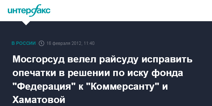 Мосгорсуд велел райсуду исправить опечатки в решении по иску фонда "Федерация" к "Коммерсанту" и Хаматовой