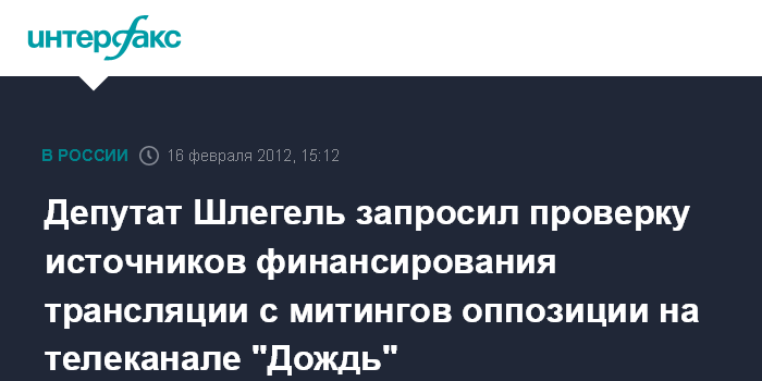 Москва. 16 февраля. INTERFAX.RU - Прокуратура проверит источники финансирования трансляции митингов на Болотной площади и проспекте академика Сахарова на телеканале "Дождь" по запросу депутата-единоросса Роберта Шлегеля, сообщила гендиректор телеканала Наталья Синдеева.