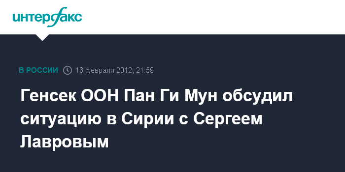 "Они (Пан Ги Мун и Лавров - ИФ) обменялись мнениями по ситуации в Сирии. Генеральный секретарь подчеркнул важность скорейшего прекращения насилия и кровопролития", - говорится в документе, опубликованном на странице ООН в сети микроблогов Twitter.