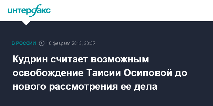 Москва. 16 февраля. INTERFAX.RU - Экс-министр финансов РФ Алексей Кудрин считает, что решение суда отправить на новое рассмотрение дело активистки "Другой России" Таисии Осиповой должно служить основанием для ее временного освобождения.