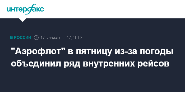 Москва. 17 февраля. INTERFAX.RU - ОАО "Аэрофлот - российские авиалинии" 17 февраля объединил ряд внутренних рейсов в связи с метеоусловиями и чисткой взлетно-посадочной полосы от снега в аэропорту "Шереметьево", говорится в сообщении авиакомпании.