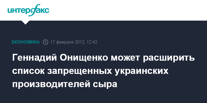 Москва. 17 февраля. INTERFAX.RU - Перечень украинских производителей, чьи сыры запрещены к ввозу в РФ, может быть расширен, если Роспотребнадзор продолжит выявлять подобную продукцию, не соответствующую российским требованиям, заявил глава ведомства Геннадий Онищенко.