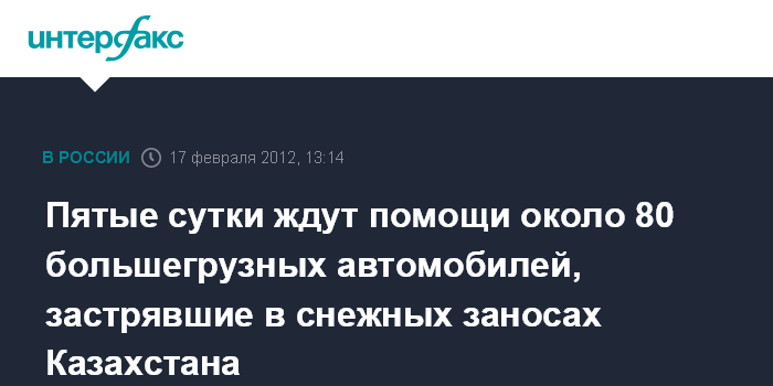 Актау. 17 февраля. INTERFAX.RU - В Мангистауской области Казахстана на автодороге Актау-Бейнеу близ поселка Сай-Утес в снежных заносах пятые сутки стоят в ожидании помощи порядка 80 большегрузных автомобилей.