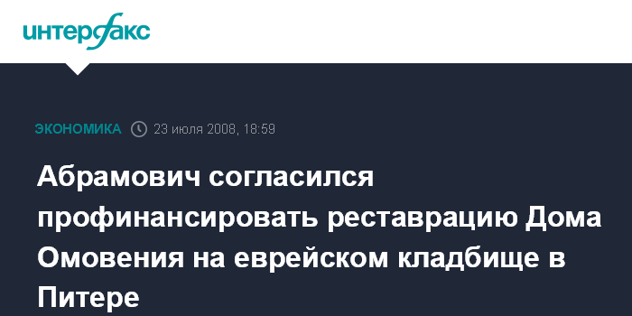 Санкт-Петербург. 23 июля. INTERFAX.RU - В Северной Столице на Еврейском Преображенском кладбище в ближайшее время начнутся работы по реставрации Дома Омовения и благоустройству самого кладбища на средства председателя попечительского совета Федерации Еврейских Общин России Романа Абрамовича.