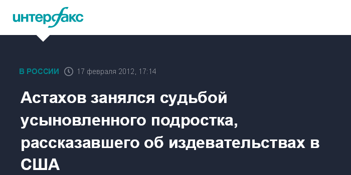 Москва/Чебоксары. 17 февраля. INTERFAX.RU - Уполномоченный при президенте РФ по правам ребенка Павел Астахов направил обращение в МИД РФ с просьбой проверить информацию о жестоком обращении американцев с приемным сыном из России.