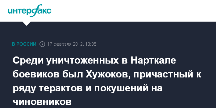 По его данным, Т.Хужоков был причастен к ряду террористических преступлений, покушений на сотрудников правоохранительных органов и чиновников, в частности, к обстрелу 2 февраля главы Урванского района КБР Антимиркана Канокова, в результате которого погиб сопровождавший чиновника участковый местного РОВД.