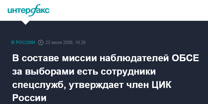 Москва. 23 июля. ИНТЕРФАКС - Член ЦИК Игорь Борисов заявляет: Центризбирком располагает данными о том, что в составе миссии международных наблюдателей по линии ОБСЕ работают сотрудники западных спецслужб.