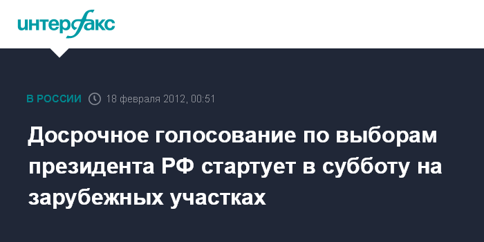 Москва. 18 февраля. ИНТЕРФАКС - 18 февраля начинается досрочное голосование на выборах президента РФ на избирательных участках, образованных за пределами России для отдельных групп избирателей.