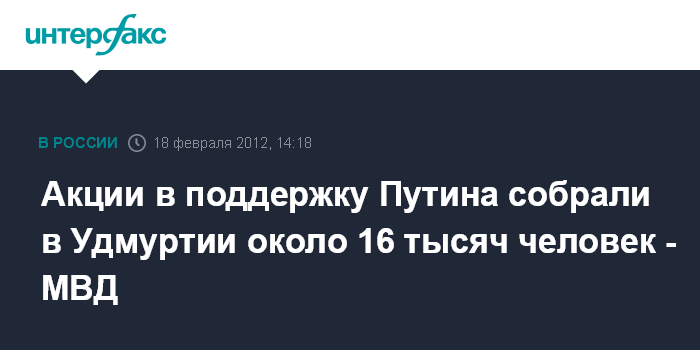 Ижевск. 18 февраля. INTERFAX.RU - В Удмуртии в субботу прошло 32 митинга и пикета в поддержку кандидата в президенты РФ Владимира Путина. Заместитель начальника полиции по охране общественного порядка МВД по Удмуртии Сергей Козлов сообщил журналистам, что в акциях приняло участие около 16 тыс. человек.