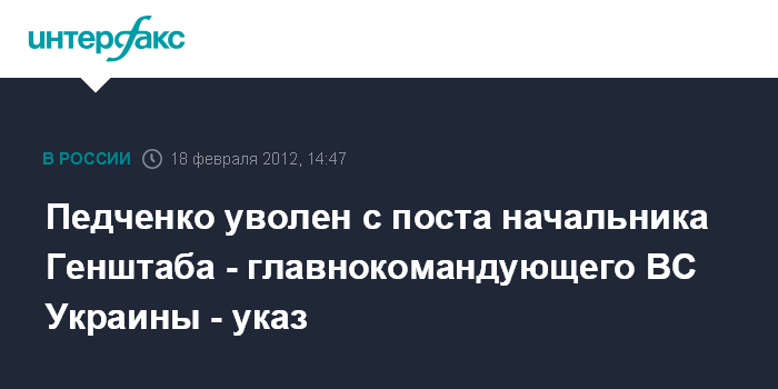 Киев. 18 февраля. INTERFAX.RU - Президент Украины Виктор Янукович уволил Григория Педченко с должности начальника Генерального штаба - главнокомандующего Вооруженных сил Украины. Соответствующий указ от 18 февраля размещен на официальном сайте главы государства в субботу.