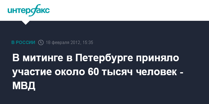 Санкт-Петербург. 18 февраля. INTERFAX.RU - Митинг сторонников Владимира Путина "За великую Россию" собрал в Петербурге около 60 тыс. участников, сообщили "Интерфаксу" в субботу в пресс-службе главного управления МВД по северной столице и Ленинградской области. "В митинге приняло участие около 60 тыс. человек", - сказал собеседник. Он подчеркнул, что никаких серьезных нарушений законодательства в ходе акции выявлено не было.