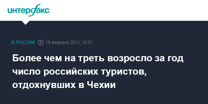 Москва. 18 февраля. INTERFAX.RU - Число туристических прибытий, совершенных россиянами в прошлом году в Чехию, составило почти 570 тыс., что на 37,4% больше, чем в 2010 году, сообщила порталу "Интерфакс-Туризм" руководитель офиса Национального туристического управления Чешской Республики Моника Лингартова.