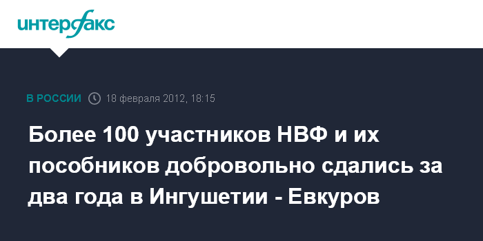 Назрань. 18 февраля. INTERFAX.RU - Проблемы возвращения боевиков к мирной жизни обсудили на первом форуме неправительственных общественных и правозащитных организаций Северо-Кавказского федерального округа, проходящем в субботу в Назрани. "В 2010-2011 годах мы склонили к явке с повинной более 100 участников НВФ и их пособников", - сообщил глава Ингушетии Юнус-Бек Евкуров, выступая на форуме.