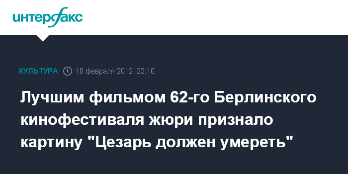 Берлин. 18 февраля. ИНТЕРФАКС - Фильм "Цезарь должен умереть" Пауло и Витторио Тавиани стал обладателем "Золотого медведя" - главной награды 62-го Берлинского кинофестиваля, сообщает корреспондент "Интерфакса".