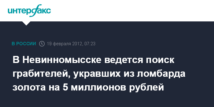 Ростов-на-Дону. 19 февраля. ИНТЕРФАКС-ЮГ - В Невинномысске Ставропольского края в субботу был ограблен ломбард, сообщили агентству "Интерфакс-Юг" в правоохранительных органах города.