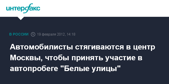 Москва. 19 февраля. INTERFAX.RU - Московские автомобилисты подъезжают в центр города для участия в автопробеге "Белые улицы" в рамках оппозиционной акции "За честные выборы", сообщил координатор Общества "Синих ведерок" (ОСВ) Данила Линдэле. "Пока машин с белой символикой сравнительно немного, но они встречаются практически на всех центральных улицах Москвы", - сказал Д.Линдэле в воскресенье "Интерфаксу".