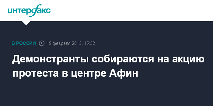Афины. 19 февраля. INTERFAX.RU - Жители столицы Греции постепенно собираются в центре города на очередную акцию протест против вводимых правительством мер бюджетной экономии, сообщают местные СМИ. В демонстрации, как ожидается, примут участие десятки тысяч человек. Во время прошлых подобных акций протеста в Афинах нередко происходили столкновения демонстрантов с полицией.